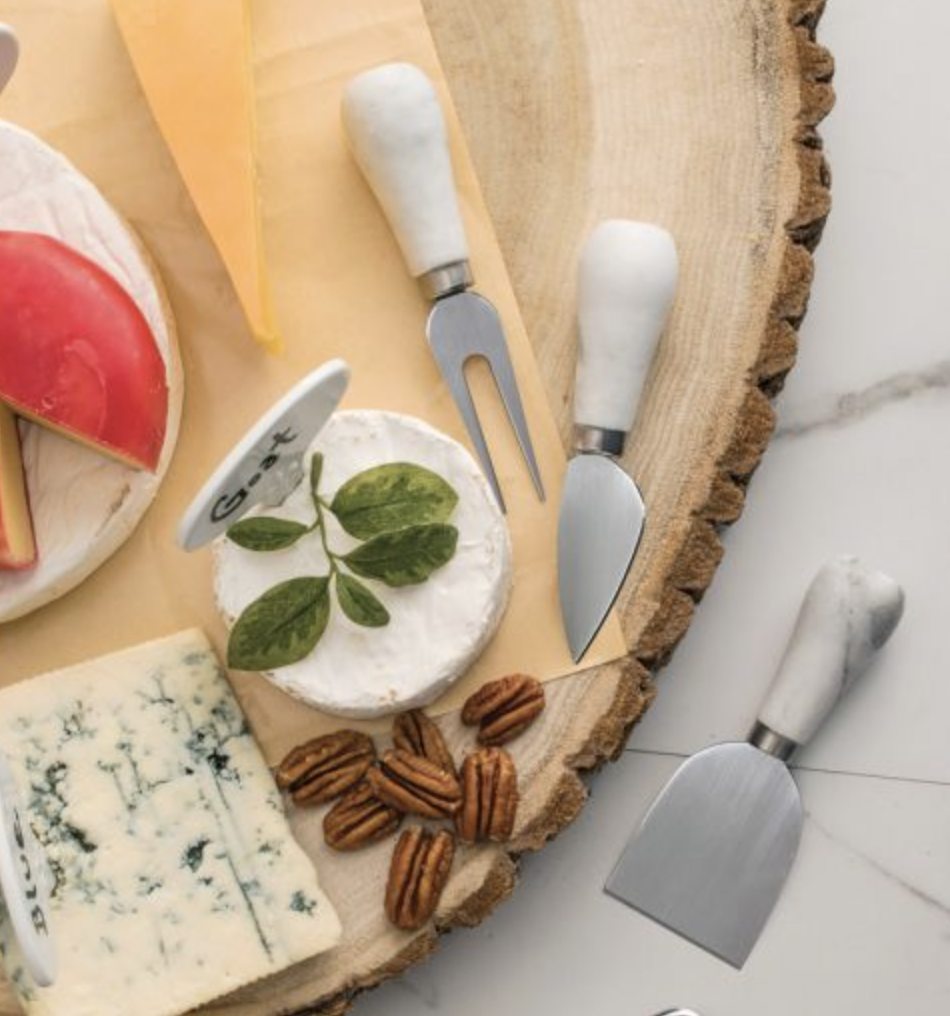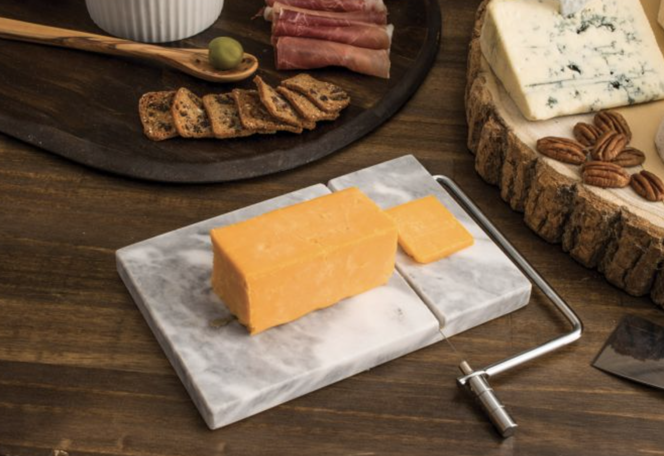 Rounding out the cheese service items is the Marble Cheese Slicer (#22042) – perfect for slicing all kinds of cheese, especially hard cheeses. Great for everyday use or entertaining with cheese and charcuterie boards, simply set cheese on the slicer base with the wire up and lower the wire to slice. Create slices, cheese sticks or cubes.