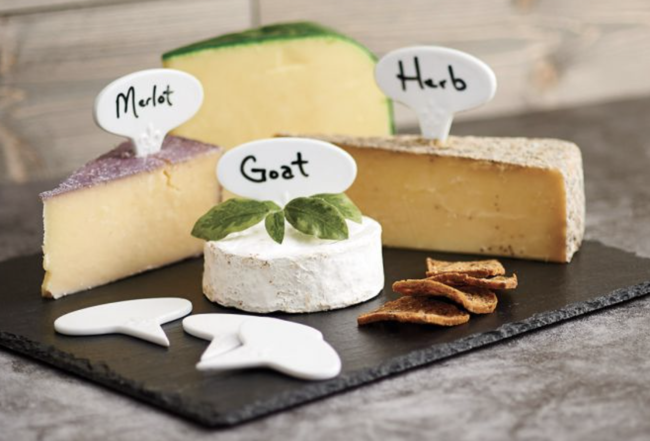 Coordinating nicely with the Cheese Tools is the Maison du Fromage Cheese Markers with Pen, set of 6 (#22037), designed to allow you identify cheese for gatherings. Made from fine-white porcelain, the 2.5” cheese markers are easy to use. Simply write on the marker using the pen (included), then insert into the cheese. They won’t smudge, but are easily cleaned by hand or in the dishwasher.